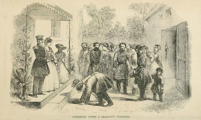 Однако особой нужды применять кнут нет (и это тоже общее место), настолько покорен и безропотен народ. А это, в свою очередь, является следствием крепостного права, которое ввергло крестьян в рабское состояние: "Приученный к покорности и ужасающему рабству, крестьянин совершенно безразличен ко всему, что его окружает. Управляющий его обкрадывает, хозяин, дабы удовлетворить свою похоть, забирает его дочь, а он благодарит его за честь, оказанную его семье".
