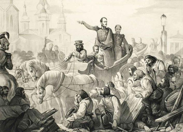 Отношение к императору Николаю Павловичу у французского наблюдателя — трепетно-возвышенное. Государь — "один из самых прекрасных и великодушных людей империи", добросердечный и по-отечески заботящийся о своих подданных. Жюльвекур рассказал о случае, связанном с эпидемией холеры, разразившейся в Москве. Когда император узнал об этом, то, ничего не сказав семье, принял решение той же ночью отправиться в Москву. В назначенный час почтовый дилижанс ждал Николая Павловича у секретного выхода из дворца, однако, когда император уже собрался выходить, оказалось, что его секрет раскрыт, и императрица и дети со слезами и объятиями бросились к нему. Император обнял детей и, повернувшись к Александре Федоровне, с нежностью сказал: "Дайте мне пройти, в Москве у меня тоже дети, которых я должен повидать". Он уехал и оставался в Москве до тех пор, пока эпидемия не пошла на спад. На самом деле император Николай дважды посещал Москву во время эпидемии холеры, но не оставался в древней столице на весь период болезни.