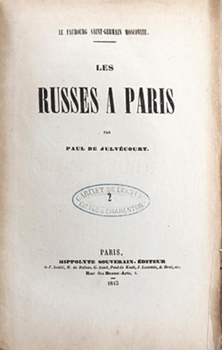 Чем русские аристократы занимались в Париже? В первой части романа "Московское предместье Сен-Жермен" Жюльвекур описал распорядок дня некоего графа Аксанина (фамилии героев весьма показательны, автор подчеркивал, что все имена вымышленные: генерал Снегов, мадемуазель Людмилофф (графиня Аксанина), князь Рубецкой, Барышкин, Болтунофф). Утром граф Аксанин посещал Сорбонну, после обеда слушал знаменитых проповедников, в шесть часов обедал в модных ресторанах, потом шел на спектакль "и не возвращался домой, не посетив несколько злачных мест". По словам Жюльвекура, "русские 1840 года были англичанами образца 1820-го". В принципе, именно так свой распорядок дня описывали русские путешественники, оказавшиеся в Париже.
