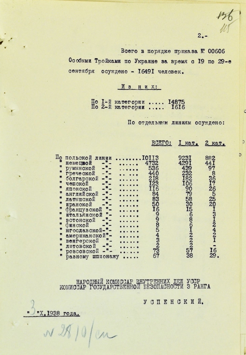 «Постановление ЦК ВКП(б): 1. Разрешить Наркомвнуделу продолжить до 15 апреля 1938 года операцию по разгрому шпионско-диверсионных контингентов из поляков, латышей, немцев, эстонцев, финн, греков, иранцев, харбинцев, китайцев и румын, как иностранно-подданных, так и советских граждан, согласно существующих приказов НКВД СССР. 2. Оставить до 15 апреля 1938 года существующий внесудебный порядок рассмотрения дел арестованных по этим операциям людей, вне зависимости от их подданства. 3. Предложить НКВД СССР провести до 15 апреля аналогичную операцию и погромить кадры болгар и македонцев, как иностранных подданных, так и граждан СССР». Подписи: «За» Сталин, Молотов, Каганович, Ворошилов, Микоян, Чубарь // 31 января 1938 года